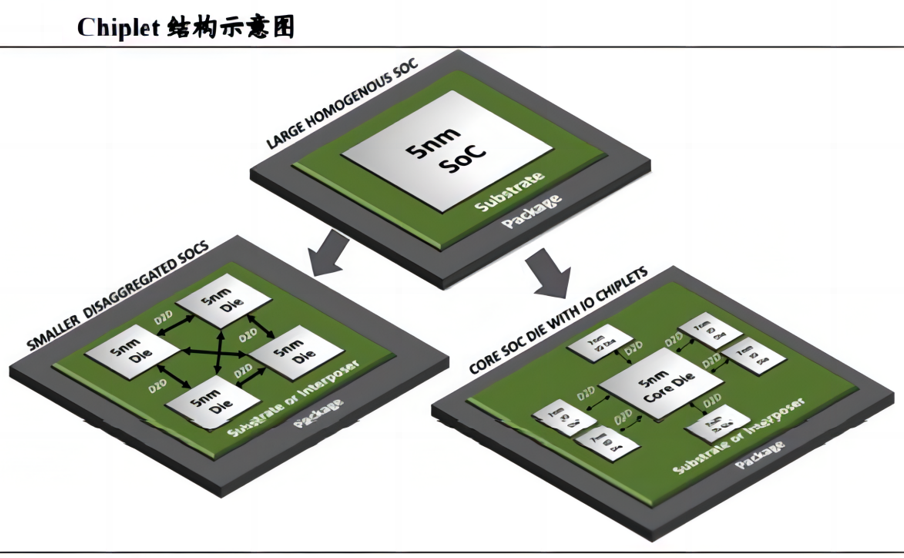 Chiplet即小芯片之意,指在晶圓端將原本一顆“大”芯片(Die)拆解成幾個“小”芯片(Die),因單個拆解后的“小”芯片在功能上是不完整的,需通過封裝,重新將各個“小”芯片組合起來,功能上還原原來“大”芯片的功能。Chiplet可以將一顆大芯片拆解設(shè)計成幾顆與之有相同制程的小芯片,也可以將其拆解成設(shè)計成幾顆擁有不同制程的小芯片。