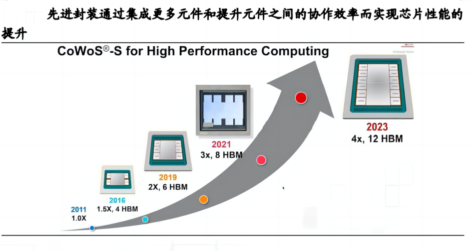先進封裝是對應(yīng)于先進圓晶制程而衍生出來的概念,一般指將不同系統(tǒng)集成到同一封裝內(nèi)以實現(xiàn)更高效系統(tǒng)效率的封裝技術(shù)。換言之,只要該封裝技術(shù)能夠?qū)崿F(xiàn)芯片整體性能(包括傳輸速度、運算速度等)的提升,就可以視為是先進封裝。傳統(tǒng)的封裝是將各個芯片單獨封裝好,再將這些單獨的封裝芯片裝配到PCB主板上構(gòu)成完整的系統(tǒng),芯片間的信息交換屬于PCB級的互連(interconnect),又稱板級互連;或者將不同的芯片貼裝到同一個封裝基板Substrate上,再完成系統(tǒng)級的封裝,芯片間的通訊屬于Substrate級的互連。這兩種形式的封裝互連技術(shù),芯片間的信息傳輸需要通過PCB或Substrate布線完成。理論上,芯片間的信息傳輸距離越長,信息傳遞越慢,芯片組系統(tǒng)的性能就越低。因此,同一芯片水平下,PCB級互連的整體性能比Substrate級互連的性能弱。在摩爾定律失效之前,芯片系統(tǒng)性能的提升可以完全依賴于芯片本身制程提升(制程提升使得芯片集成晶體管數(shù)量提升)。但隨著摩爾定律失效,芯片制程提升速度大大放緩,芯片系統(tǒng)性能的提升只能通過不斷優(yōu)化各個芯片間的信息傳輸效率,圓晶Wafer級封裝互連技術(shù)的價值凸顯。Wafer級的封裝互連技術(shù),將不同的SoC集成在TSV(硅通孔技術(shù):Through silicon via)內(nèi)插板(interposer)上。Interposer本身材料為硅,與SoC的襯底硅片相同,通過TSV技術(shù)以及再布線(RDL)技術(shù),實現(xiàn)不同SoC之間的信息交換。換言之,SoC之間的信息傳輸是通過Interposer完成。Interposer再布線采用圓晶光刻工藝,比PCB和Substrate布線更密集,線路距離更短,信息交換更快,因此可以實現(xiàn)芯片組整體性能的提升。圖XX示例為CoWoS封裝(Chip on Wafer on Substrate),CPU/GPU die與Memory die通過interposer實現(xiàn)互連,信息直接通過interposer上的RDL布線傳輸,不經(jīng)過Substrate或PCB,信息交換快,系統(tǒng)效率高。從半導(dǎo)體制程進入10nm以來,摩爾定律已經(jīng)失效,即芯片迭代不再滿足“集成電路芯片上所集成的晶體管數(shù)目,每隔18個月就翻一番;微處理器的性能每隔18個月提高一倍,而價格下降一倍”。在后摩爾定律時代,對于“more than moore”的延續(xù),先進封裝是業(yè)界公認(rèn)的有效途徑。