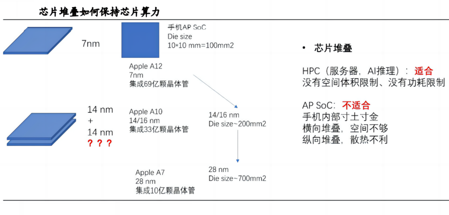 大功耗、高算力的場景,先進封裝/Chiplet有應(yīng)用價值在先進制程不可獲得的情況下,通過芯片堆疊(先進封轉(zhuǎn)/Chiplet)和計算架構(gòu)重構(gòu),以維持產(chǎn)品性能。以APPLE的A系列芯片參數(shù)為例,A12、A10、A7芯片分別采用7 nm、14/16 nm(Samsung 14 nm、TSMC 16 nm)、28 nm制程。A系列的手機AP芯片,通常芯片面積(Die Size)在約100 mm2大小。在這100 mm2大小的芯片上, A12、A10、A7芯片分別集成了約69億、33億、10億顆晶體管。下面,我們簡單進行算術(shù)換算,討論降制程如何維持芯片的算力。如果芯片工藝從7 nm降至14 nm,A12芯片上7nm工藝集成69億顆晶體管,如果用14 nm工藝以試圖達(dá)到接近的算力,首先要保證晶體管數(shù)目與A12芯片一致,即~70億顆,且在未考慮制程提升對單個晶體管性能有顯著提升的背景下,14 nm工藝的芯片需要兩倍于7 nm工藝的面積,即~200 mm2;如果芯片工藝從7 nm降至28 nm,參考28 nm的A7芯片只集成了10億顆晶體管,如果要達(dá)到70億晶體管數(shù)目,則需要將芯片面積擴大至~700 mm2。芯片面積越大,工藝良率越低,在實際制造中得到的單顆芯片的制造成本就越高,因此,在先進制程不可獲得的背景下,降制程而通過芯片堆疊的方式,的確可以一定程度減少算力劣勢,但是因為堆疊更多芯片,需要更大的IC載板、更多的Chiplet小芯片、更多的封裝材料,也導(dǎo)致因為制程落后帶來的功耗增大、體積/面積增加、成本的增加。因此,比如,通過14 nm的兩顆芯片堆疊,去達(dá)到同樣晶體管數(shù)目的7 nm芯片性能;通過多顆28 nm的芯片堆疊,去達(dá)到14 nm芯片性能。此種堆疊方案在HPC(服務(wù)器、AI推理)、基站類大芯片領(lǐng)域可能有適用價值,但對于消費電子領(lǐng)域如手機AP芯片和可穿戴芯片,在其應(yīng)用場景對空間體積有嚴(yán)苛約束的條件下,芯片堆疊則較難施展。