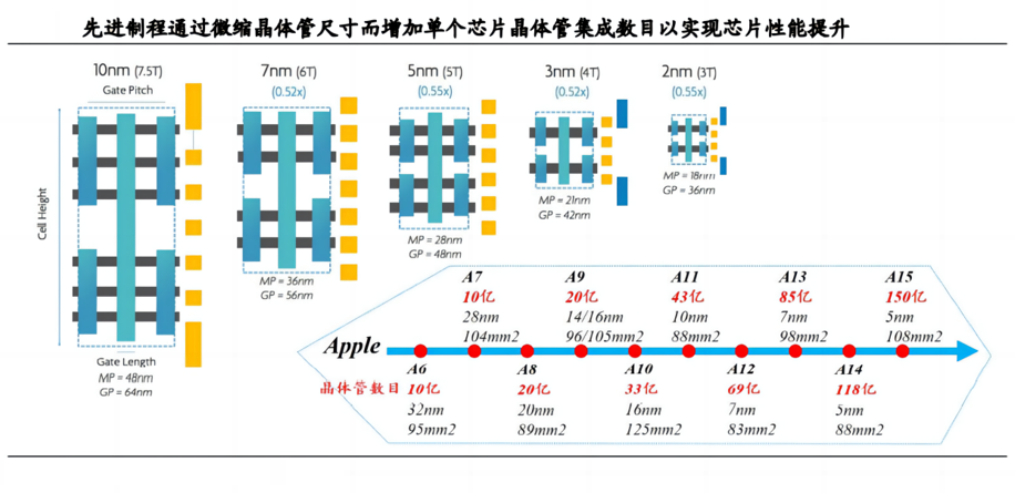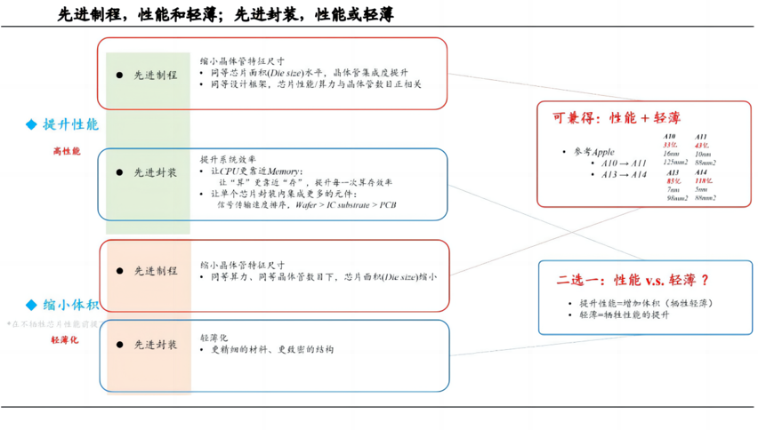 在高性能和輕薄化兩個方向上,先進制程可以做到兼顧,而先進封裝則有取舍。比如,APPLE的A系列芯片,從A10升級到A11時,由16 nm工藝提升至10 nm工藝,芯片面積從125 mm2減小至88 mm2,而晶體管集成數(shù)則由33億顆增加至43億顆;A系列芯片從A13升級到A14時,晶圓工藝從7nm升級到5nm,芯片面積從98 mm2減小至88 mm2,而晶體管集成數(shù)則由85億顆增加至118億顆,做到了性能提升和輕薄化的兼顧。而先進封裝,要做到芯片性能提升,因為封裝對晶體管尺寸微縮沒有效果,提升性能一是增加芯片內(nèi)部各元件的協(xié)作效率,二是往一個系統(tǒng)中堆疊更多的元件(本質(zhì)上也是提升了系統(tǒng)內(nèi)的晶體管數(shù)據(jù)),代價就是系統(tǒng)體積、面積更為龐大,即先進封裝提升性能的代價是犧牲輕薄,實現(xiàn)輕薄的代價是犧牲性能的提升。