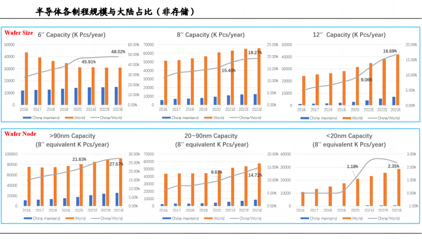 按不同晶圓尺寸統(tǒng)計,大陸6英寸晶圓產(chǎn)能已占全球近一半,而12英寸產(chǎn)能僅為全球約10%。按不同制程統(tǒng)計,大陸90 nm以上制程占全球約20%,20-90 nm制程占全球約10%,20 nm以下制程僅占全球約1%。大陸高端制程占比低,產(chǎn)業(yè)結(jié)構(gòu)存在明顯短板,未來擴產(chǎn)空間大。高端制程擴產(chǎn)投入大,3 nm制程芯片每萬片產(chǎn)能的投資約100億美元,遠(yuǎn)高于28 nm制程芯片每萬片約7億美元的投資。彌補大陸晶圓產(chǎn)業(yè)結(jié)構(gòu)短板,需重點投資高端制程晶圓制造產(chǎn)能,既需要完成技術(shù)攻關(guān),又需要大額投資支持,任重而道遠(yuǎn)。